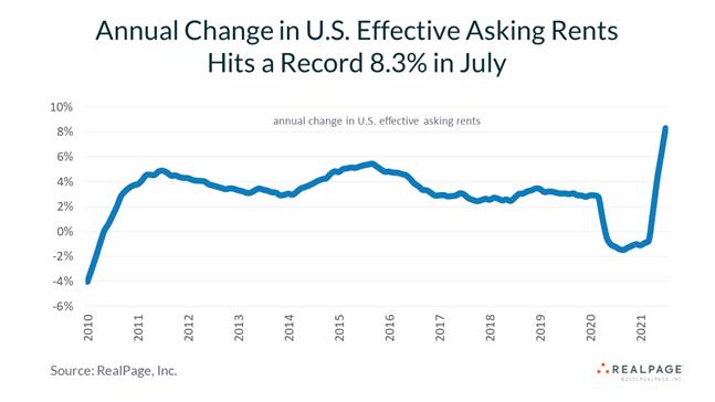 Effective asking rents rose 2.2 percent from June to July, and 8.3 percent year over year, blowing past growth records set between 2000 and 2001. As of July, the average monthly apartment rent in the U.S. hit $1,549.