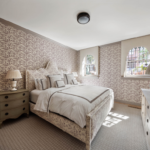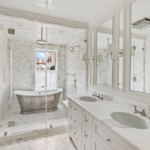 The second and third levels, which are accessible via restored original stairs, house the primary bedroom suite, home office, laundry room and two en-suite bedrooms. The primary suite’s bathroom features Calacatta gold marble walls and floors, Waterworks fixtures and a windowed wet room complete with rainfall shower and freestanding Penhaglion tub.