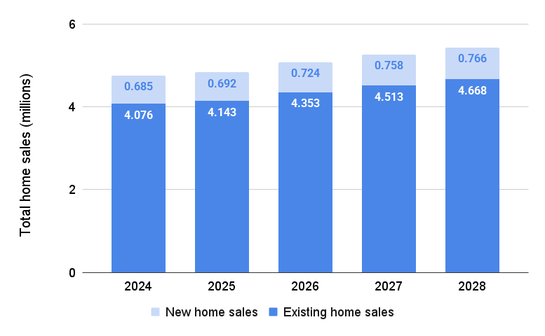 Sales of existing homes are projected to hit 4.67 million by 2028, with new home sales growing to 766,000.