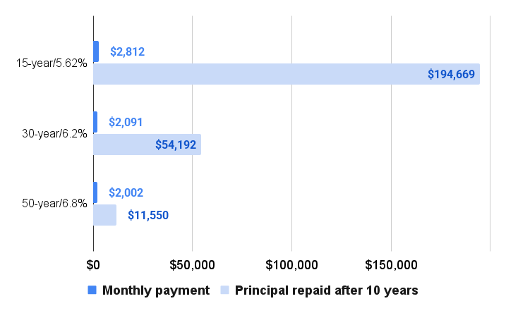 So a homebuyer opting for a 50-year mortgage would lower their monthly payment by $89, but owe $42,642 more when they’re ready to refinance or buy another home after 10 years.